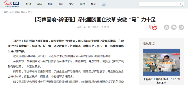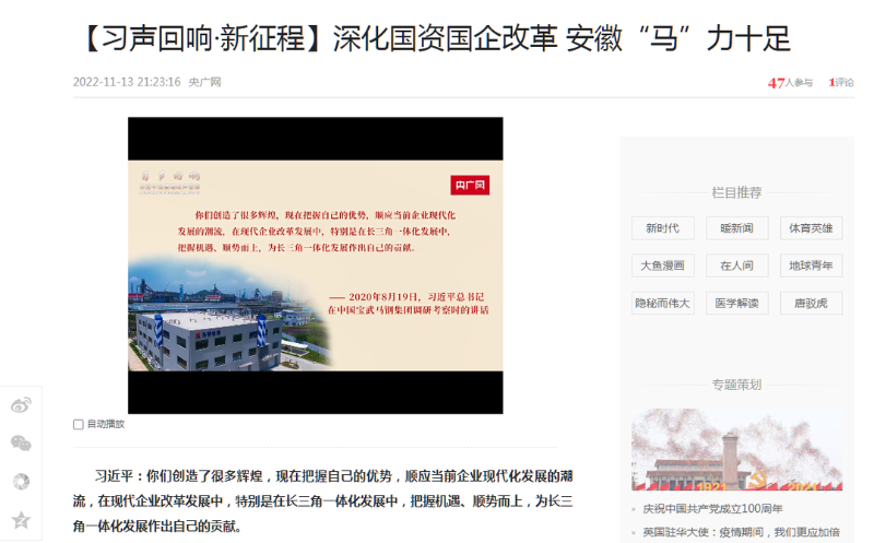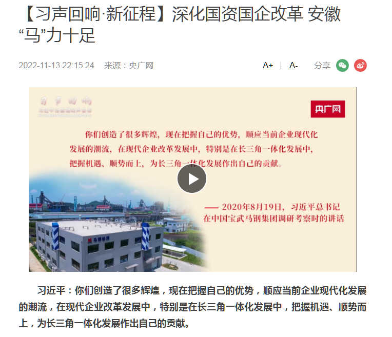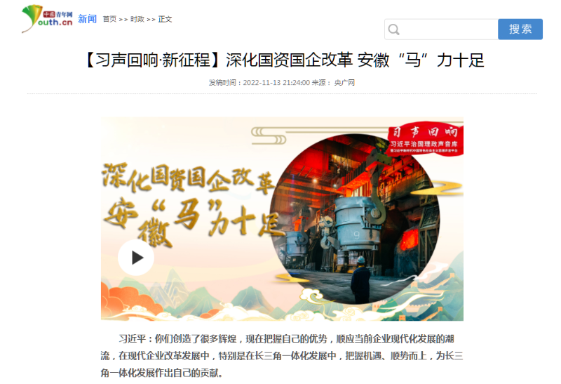 搶抓發(fā)展機遇,敢為時代先鋒。國企改革三年行動以來,安徽國資國企深化改革創(chuàng)新,不斷轉(zhuǎn)型突破,推動省屬企業(yè)高質(zhì)量發(fā)展邁上新臺階。2021年,安徽省屬國有企業(yè)經(jīng)營業(yè)績創(chuàng)歷史最好水平。今年上半年,省屬企業(yè)資產(chǎn)總額首次突破2萬億元。目前,安徽省國企改革三年行動的129項重點任務(wù)已基本完成。央廣網(wǎng)、人民網(wǎng)、中國網(wǎng)、中華網(wǎng)、光明網(wǎng)、環(huán)球網(wǎng)、中國經(jīng)濟網(wǎng)、中國青年網(wǎng)、中青在線、新浪網(wǎng)、網(wǎng)易網(wǎng)、騰訊網(wǎng)、搜狐網(wǎng)、鳳凰網(wǎng)等15家全國主流媒體及30余家省級主流媒體對此進行了集中報道。