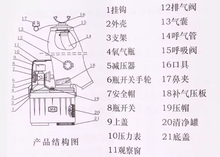 1、自救器主要由高壓系統(tǒng)、呼吸系統(tǒng)及CO2 過濾系統(tǒng)組成。高壓系統(tǒng)包括氧氣瓶、氧氣瓶開關、減壓器、自動手動補給閥和壓力表等。